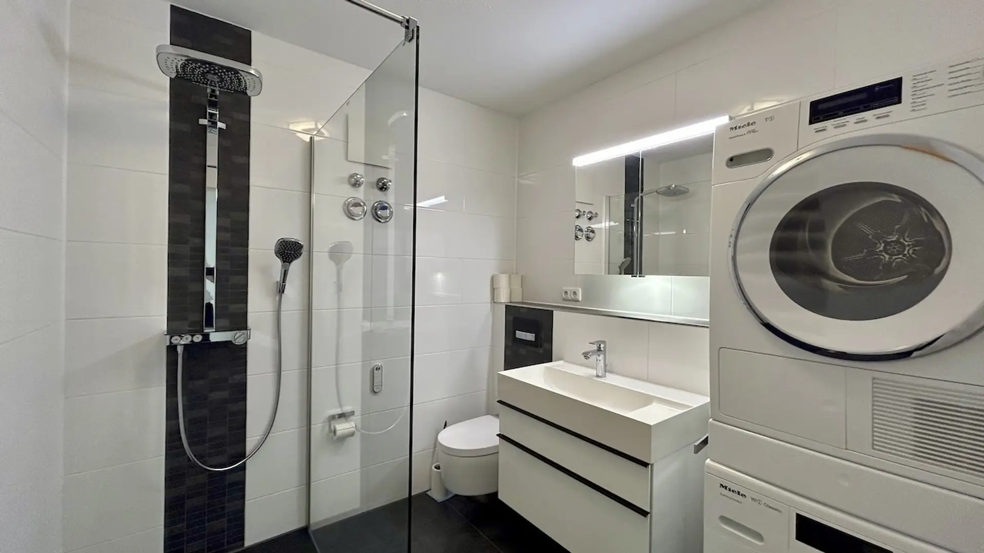 Fußbodenheizung, Steinzeugfliesen, vollmöbliert, moderne Einbauküche im Wert von ca. 17.000 Euro, Rollläden, modernes Duschbad mit beheizbarem Toilettensitz und Automatiköffnung sowie Bidet Funktion von Geberit. Tiefgaragenstellplatz, Fahrradkeller, Trockenraum, Kellerraum.