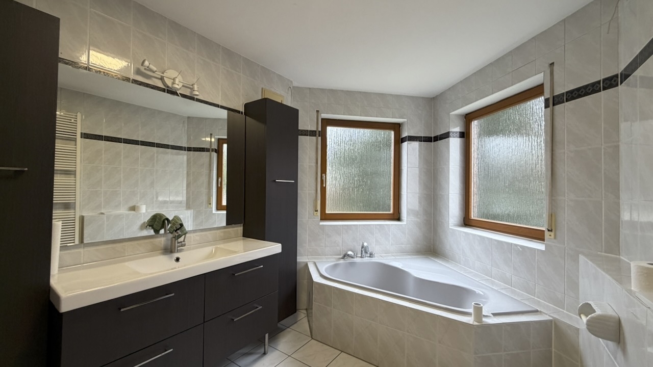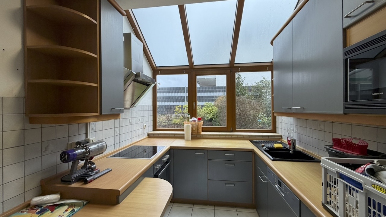 Die vorhandene Einbauküche ist funktional ausgestattet und fügt sich harmonisch in das Wohnkonzept ein. Ein Gäste-WC sorgt für zusätzlichen Komfort im Alltag. Das Tageslichtbad überzeugt mit einer Eckbadewanne und lädt zum Entspannen ein. Ein eigener Kellerraum bietet weitere Abstellmöglichkeiten, während der Außenstellplatz direkt vor dem Haus bequemes Parken garantiert.