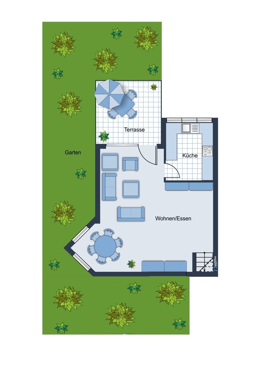 Herzstück des Wohnbereichs ist der direkte Zugang zur überdachten Terrasse und dem außergewöhnlich großen, eigenen Gartenanteil. Hier genießen Sie entspannte Stunden im Grünen, ob beim Frühstück im Freien, beim Spielen mit den Kindern oder bei geselligen Abenden mit Freunden. Eine praktische Gartenhütte bietet zusätzlichen Stauraum für Geräte und Gartenmöbel.